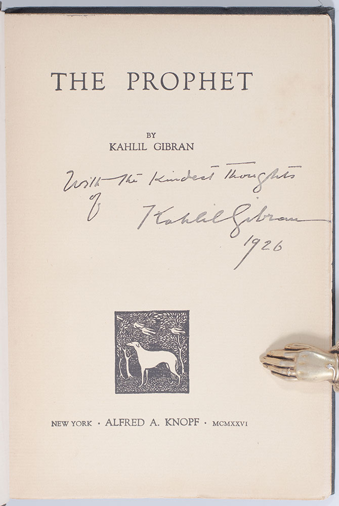Early printing of the author's masterpiece. Octavo, original cloth, with illustrations by the author. Association copy, signed by the author on the title page, "With the kindest thoughts of Kahlil Gibran 1926" and on the front free endpaper, "For my friend Cecille from Barbara Young Christmas 1926." Barbara Young was the pen name of Henrietta Breckenridge Boughton, was an art and literary critic in the 1920s and a poet; she served as Gibran's secretary from 1925 until his death, revised and published his book The Garden of the Prophet, and published a study of his life This Man from Lebanon. In very good condition. Rare and desirable signed and with noted provenance.