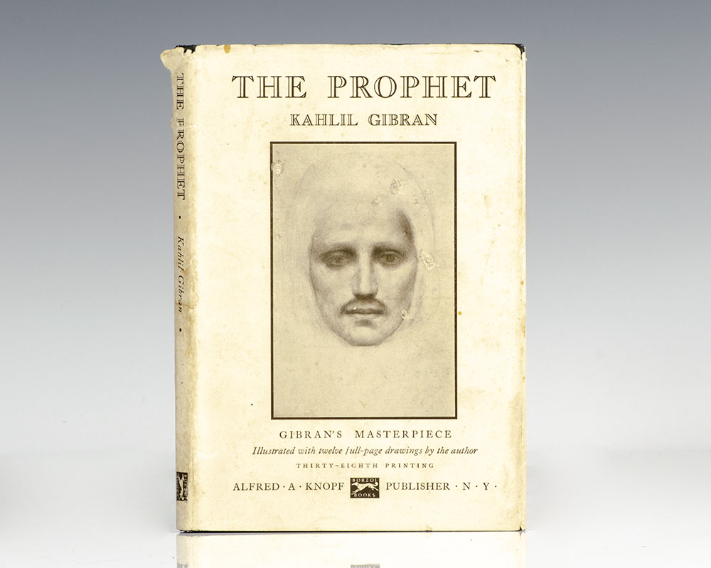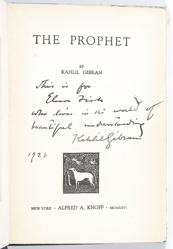 First edition, early printing of the author's masterpiece. Octavo, original cloth, with illustrations by the author. Association copy, lengthily inscribed by Kahlil Gibran on the title page, "This is for Elenor Fisch, who lives in the world of beautiful understanding. Kahlil Gibran, 1926." From the library of D. Rajagopal with his library stamp to the front pastedown. Rajagopal was the lifelong friend and editor of Indian philosopher Jiddu Krishnamurti, the leader of the Theosophy movement in the early 20th century, and one of its most famous figures. In his teachings, Krishnamurti stressed the necessity for a revolution of human consciousness, which could only occur with radical religious, political, and social change. Near fine in a very good dust jacket. Housed in a custom half morocco clamshell box. Rare and desirable signed and with noted provenance.