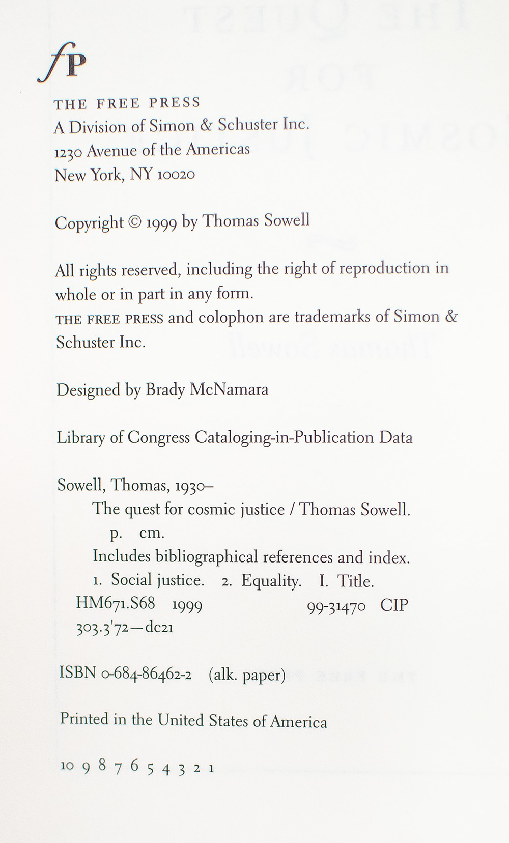First Edition of The Quest For Cosmic Justice; inscribed by Thomas Sowell