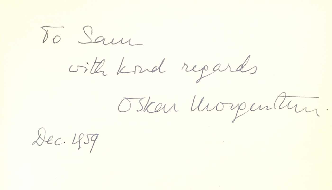 First edition of this work by the famed economist. Octavo, original cloth. Presentation copy, inscribed and dated in the year of publication by the author on the front free endpaper, "To Sam with kind regards Oskar Morgernstern Dec. 1959." Fine in a near fine price-clipped dust jacket. Jacket design by Stan Phillips.