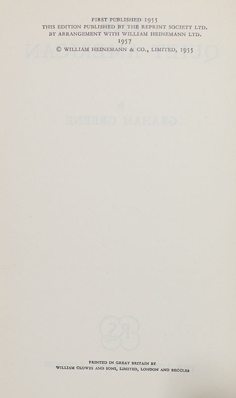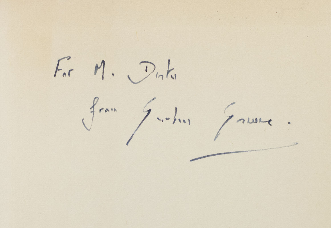 First Reprint Society edition of Greene's classic novel of exploration of love, innocence, and morality in Vietnam. Octavo, original cloth. Presentation copy, inscribed by the author on the front free endpaper, "M Duke from Graham Greene." Fine in a near fine dust jacket. Uncommon signed and inscribed.