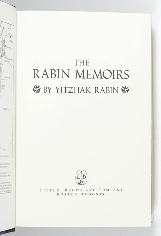 First edition in English of the memoirs of Yitzhak Rabin. Octavo, original half cloth. Presentation copy, inscribed by the author on the front free endpaper in the year of publication, "To Ruth and Allan Leigler with best wishes Y. Rabin 10.24.79." Fine in a near fine dust jacket. Jacket design by John Renfer. Photograph by Magnum photographer Leonard Freed.