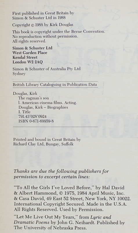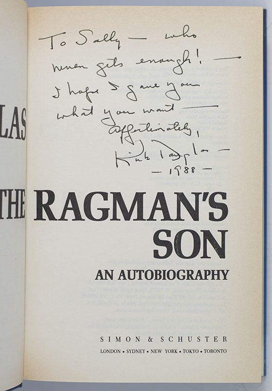 First edition of Kirk Douglas' Autobiography The Ragman's Son; inscribed by him to photographer Sally Soames