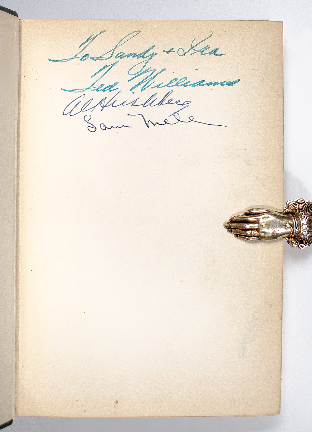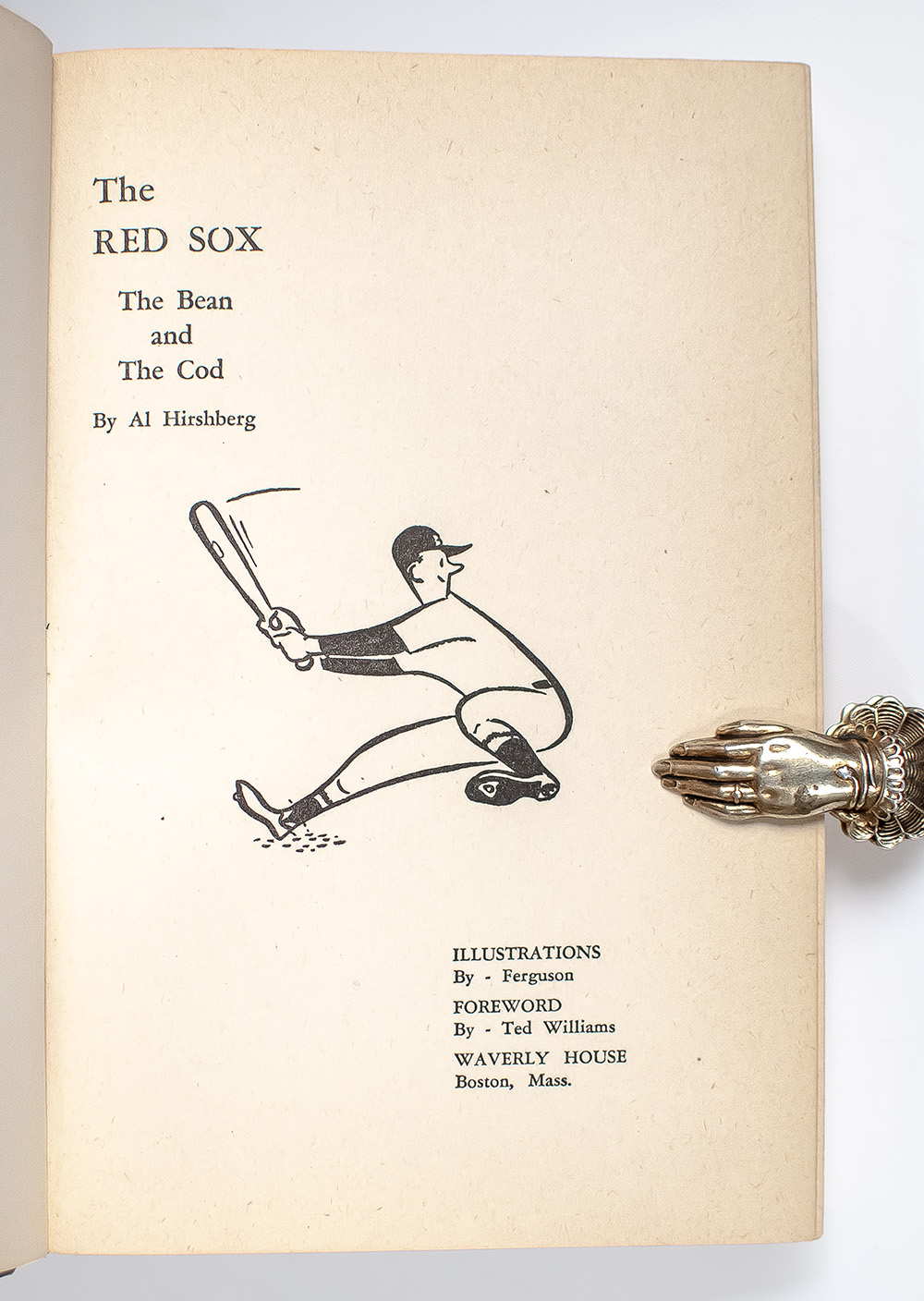 First edition of this work on the Boston Red Sox. Octavo, original cloth, illustrated. Presentation copy, inscribed by baseball legend Ted Williams on the front free endpaper and signed by Albert Hirschberg and Sam Mele, who was a major league player and manager. Near fine in a very good dust jacket. Foreword by Ted Williams. Illustrated by Ferguson. Rare and desirable signed.