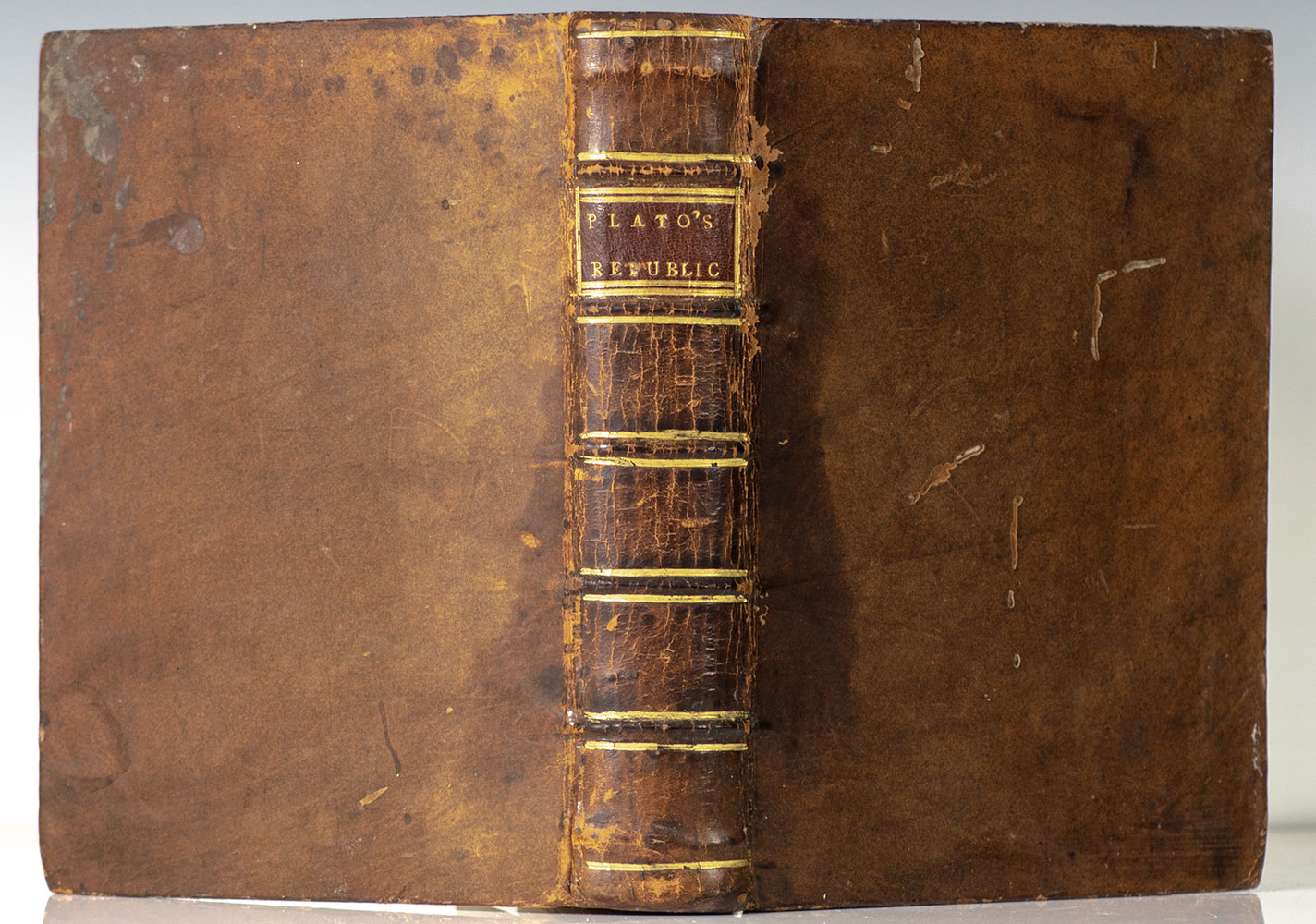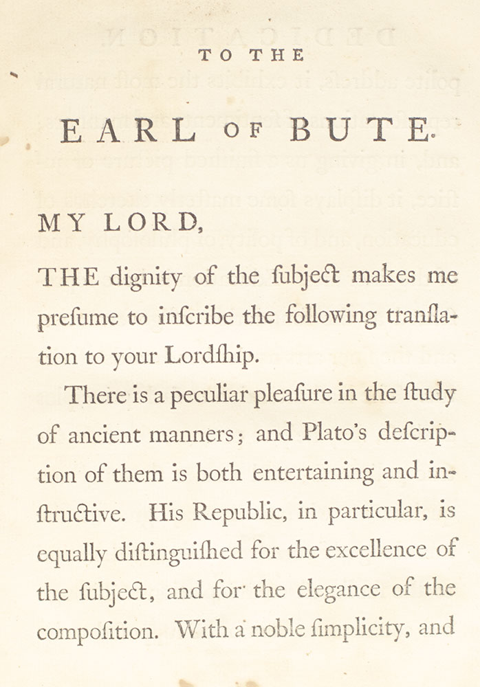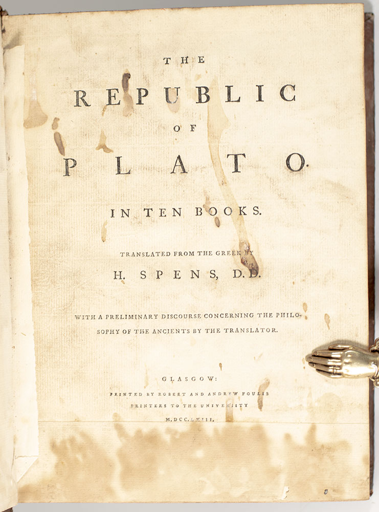 First edition in English of Plato's Republic, marking the first appearance in the English language of Plato's profoundly influential dialogue concerning the nature of justice. Quarto, bound in full polished calf with raised gilt bands to the spine, morocco spine label lettered in gilt, all edges speckled red. Harry Spens was a minister at the parish of Wemyss in Fife, and respected classicist. In his introduction he professes his intent in his translation is: "To give the English Reader a view of Plato's sentiments and manner of writing, and to stir up the youth to the study of the Ancients." Richard Garnett, in his own introduction of the Everyman's Library reprint of this translation, laments the relative lack of critical attention paid to it, writing: "On the whole, Spens's version should not be lightly esteemed. It is clearly the work of a scholar and a man of considerable literary ability..." The brothers Robert and Andrew Foulis were renowned printers of classical works in their time, sometimes referred to as 'the Elzevirs of Britain.' Their works, mostly intended for scholars, were "much sought after as admirable specimens of typography, and are noticeable for their severely plain elegance" (DNB 7: 514). In very good condition. Rare and desirable.