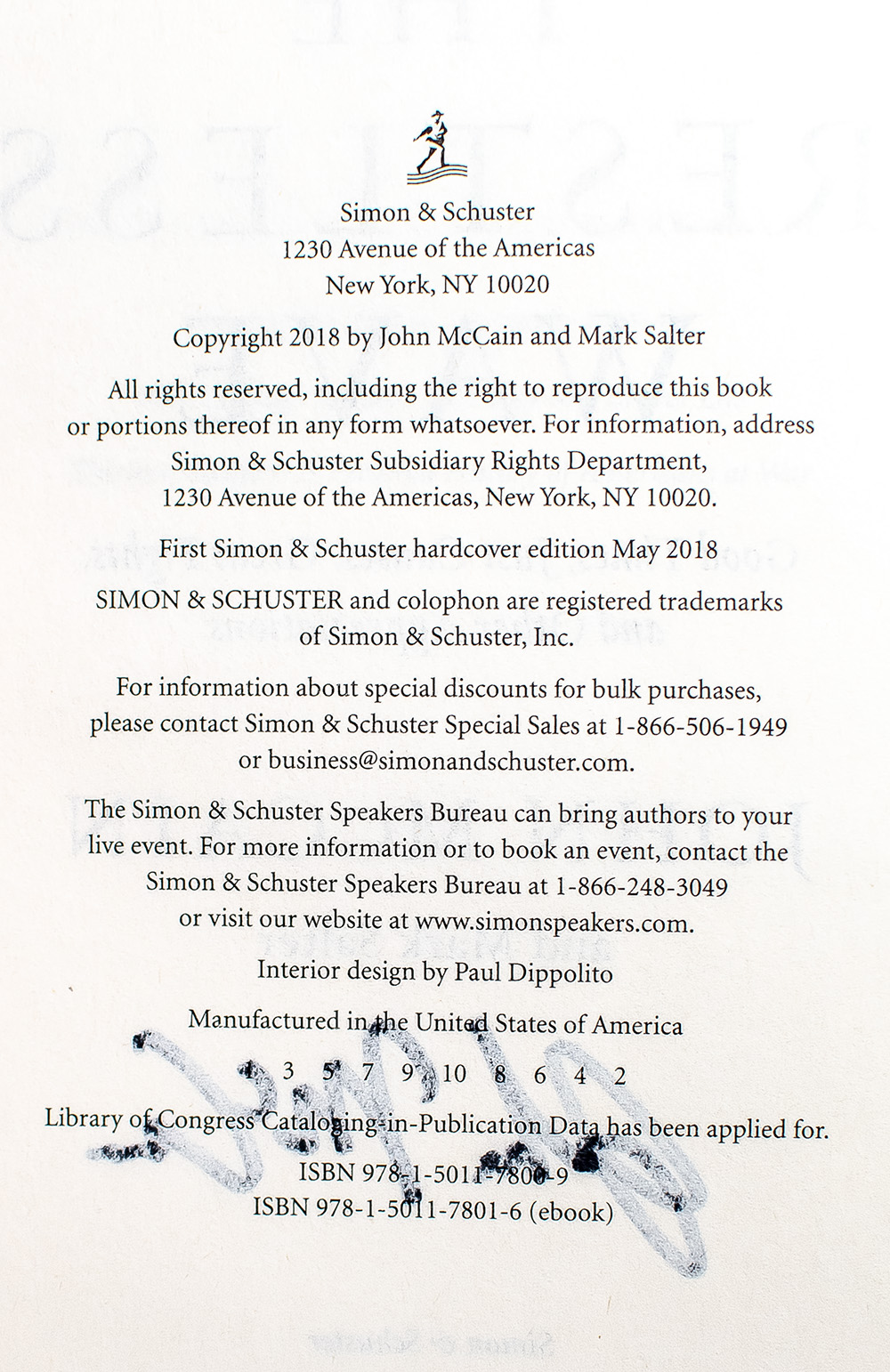 First edition of this political memoir from Senator McCain, an American hero who reflects on his life and what matters most. Octavo, original boards. Boldly signed by John McCain on the title page. Fine in a fine dust jacket. Jacket design by Jackie Seow. Rare and desirable signed as this memoir was published in May 2018 and Senator McCain passed away in August of the same year.