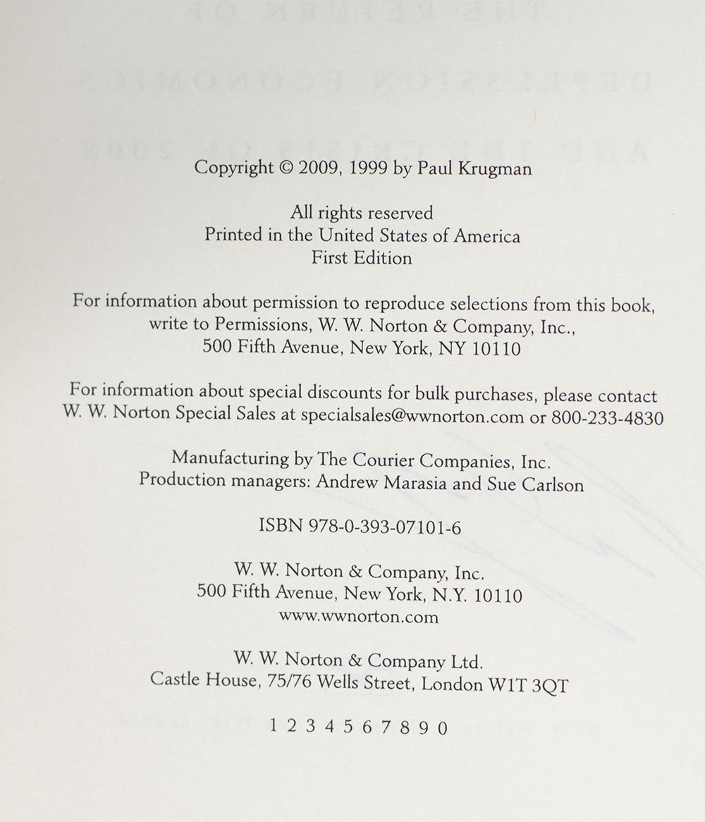First Edition of Paul Krugman's The Return of Depression Economics and the Crisis of 2008; Signed by Him