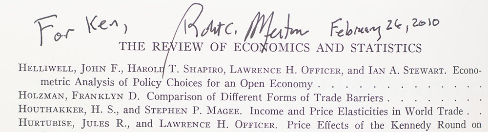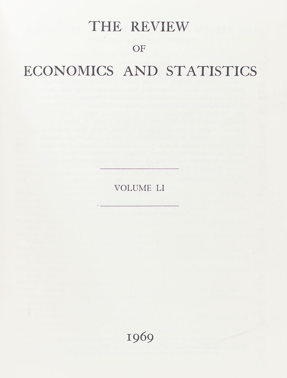 Volume LI of Harvard University's Review of Economics and Statistics containing Robert Merton's Lifetime Portfolio Selection Under Uncertainty; inscribed by him to fellow Nobel prize-winning economist Kenneth J. Arrow
