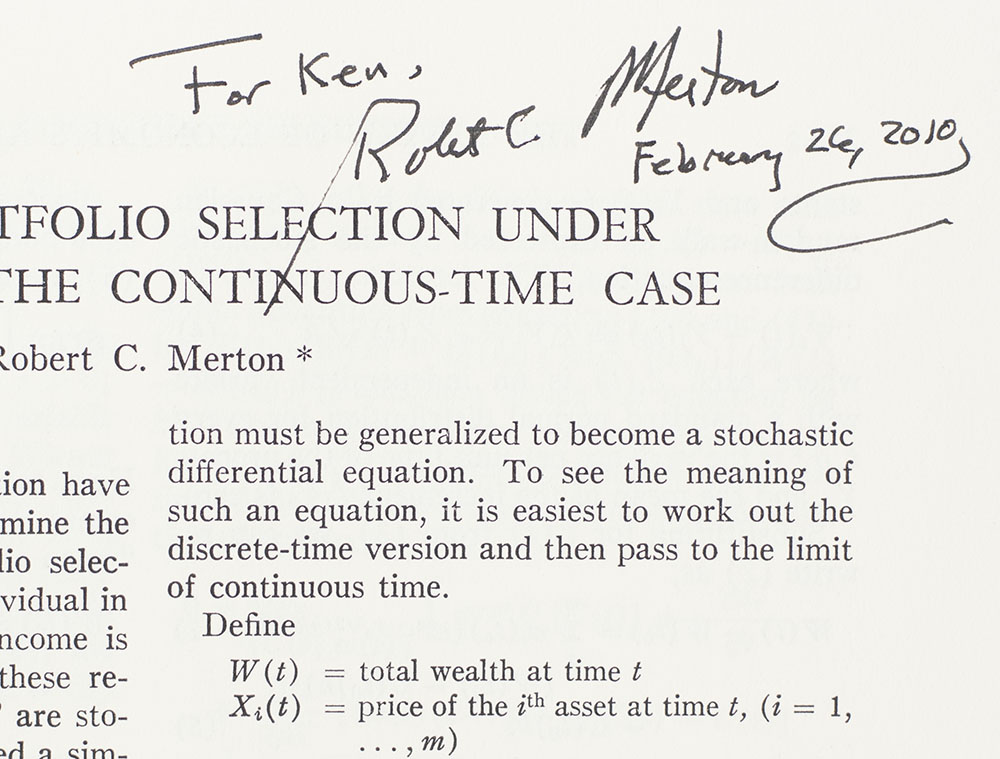 Volume LI of Harvard University's Review of Economics and Statistics containing Robert Merton's Lifetime Portfolio Selection Under Uncertainty: The Continuous-Time Case, which introduced the concepts of continuous-time optimization later featured in his landmark work Continuous-Time Finance. Quarto, bound in full morocco with gilt titles and ruling to the spine in six compartments within raised bands, gilt ruling to the front and rear panel, all edges gilt, marbled endpapers. Association copy, inscribed twice by Robert C. Merton to fellow economist Kenneth J, Arrow on the table of contents page referencing his work, "For Ken, Robert Merton February 26, 2010" and on the introductory page of 'Lifetime Portfolio Selection Under Uncertainty' [p. 247], "For Ken, Robert Merton February 26, 2010." The recipient, American economist Kenneth J. Arrow was the joint winner of the Nobel Memorial Prize in Economic Sciences with John Hicks in 1972. In economics, he was a major figure in post-World War II neo-classical economic theory. Many of his former graduate students have gone on to win the Nobel Memorial Prize themselves. His most significant works are his contributions to social choice theory, notably "Arrow's impossibility theorem", and his work on general equilibrium analysis. He has also provided foundational work in many other areas of economics, including endogenous growth theory and the economics of information. In fine condition. An exceptional association copy linking two Nobel Prize-winning economists.