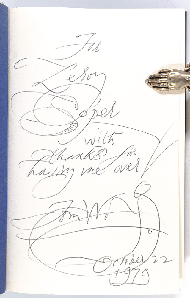 First edition of Wolfe's classic work. Octavo, original cloth with titles to the spine in silver. Presentation copy, lengthily inscribed by the author in the year of publication, "For Leroy Soper, with thanks for having me over Tom Wolfe October 22 1979." Fine in a near fine dust jacket. Jacket design by Kiyoshi Kanai. Housed in a custom half morocco slipcase.