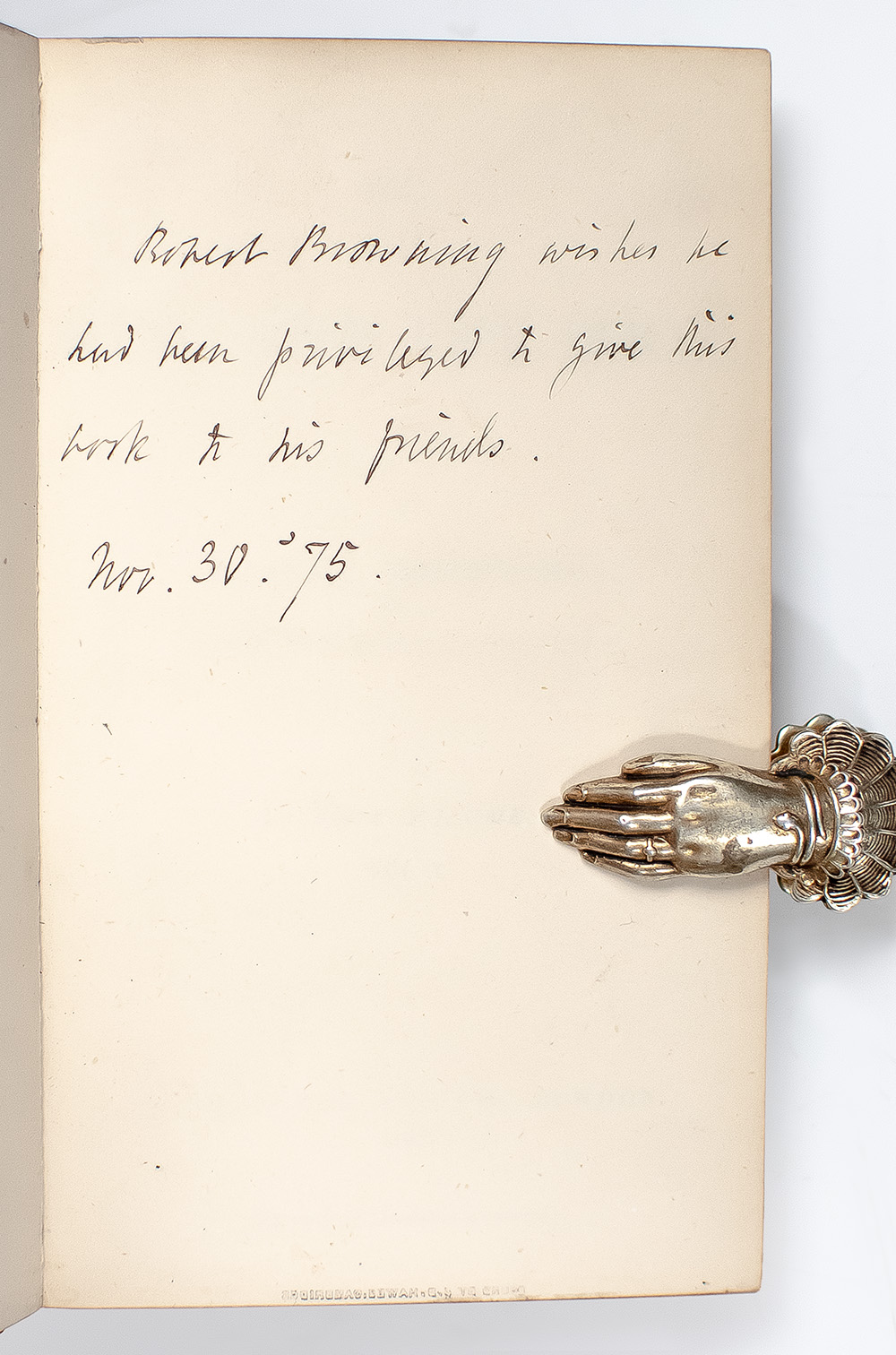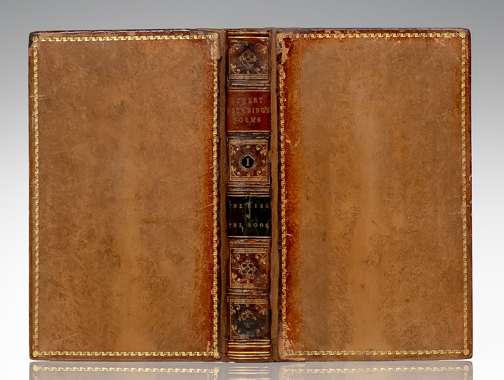First edition of Robert Browning's greatest work. Octodecimo, four volumes, contemporary tree calf bound in full morocco with gilt titles and tooling to the spines in six compartments within gilt raised bands, gilt ruling to boards, marbled endpapers, all edges marbled. Presentation copy, inscribed by the author on the second free endpaper, "Robert Browning wishes he had been privileged to give this work to his friends. Nov. 30. '75." The recipient, George Craik was a partner in Macmillan and Co., who married author Dinah Maria Mulock in 1864. Mulock was a friend and correspondent of Robert and Elizabeth Barrett Browning, and dedicated her novel 'The Head of the Family' to Elizabeth. In very good condition with rubbing to the extremities, splitting to the hinges of volume four, and skillful rebacking to preserve the original spines of each volume. From the library of noted collector William A. Strutz with his small bookplate to the pastedown, with an additional ownership plate from George Lillie Craik. Housed in a custom folding chemise and half morocco slipcase.