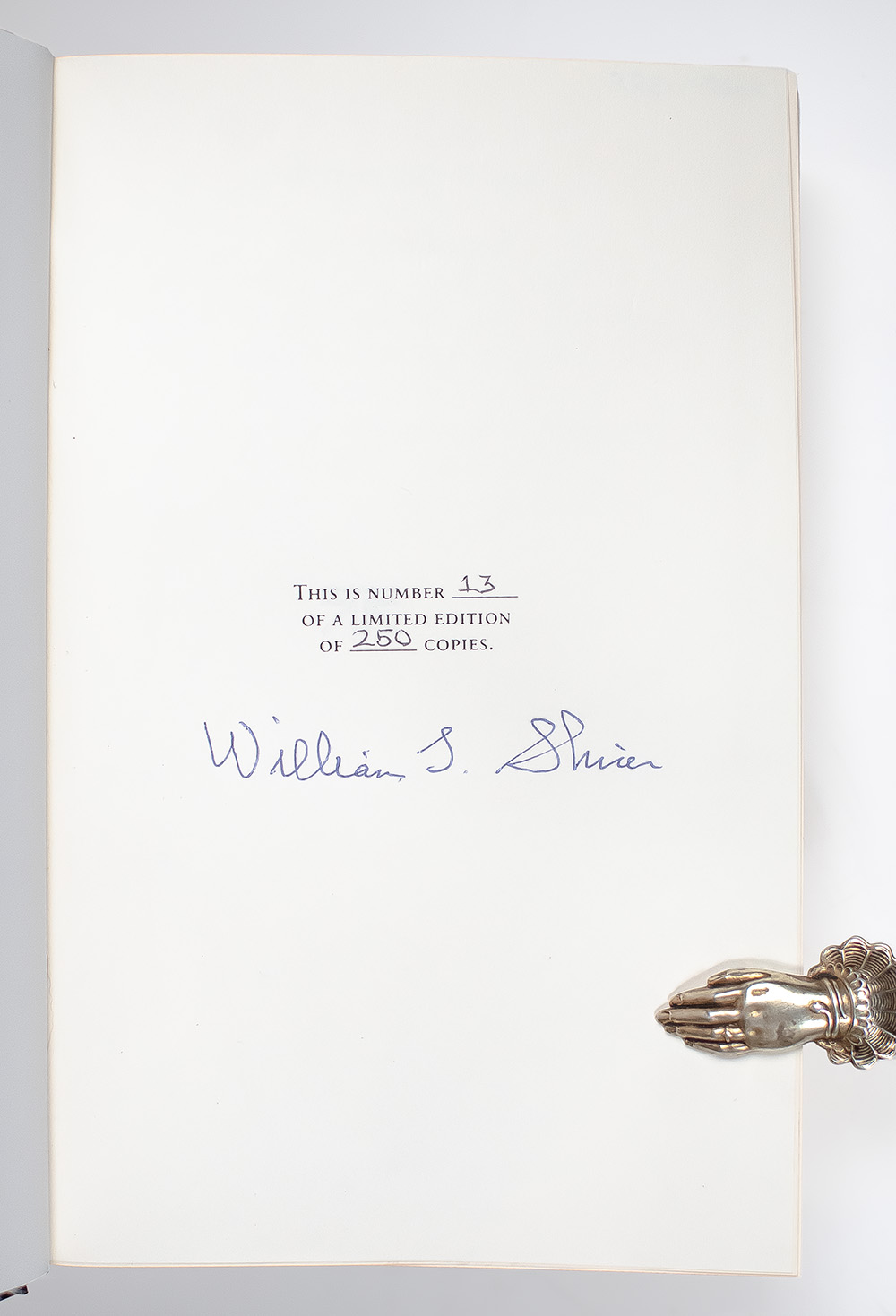Signed limited first edition of the 30th anniversary of “one of the most important works of history of our time” (Orville Prescott, New York Times). Octavo, original cloth with gilt titles to the spine, author's initials in gilt on front cover, silk endpapers, silk endpapers. Boldly signed by William L. Shirer on the limitation page. One of two hundred-fifty copies. Fine in a fine dust jacket. Housed in a custom cloth slip case also with the author's initials in gilt on front panel. Rare and desirable signed.