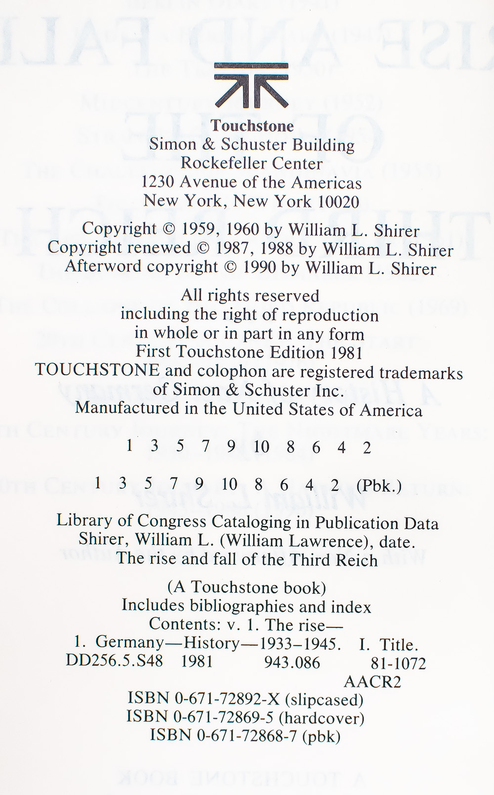 “Many of the books tossed into the flames in Berlin that night by the joyous students under the approving eye of Dr. Goebbels had been written by authors of world reputation": Signed limited Edition of This Classic work The Rise And Fall Of The Third Reich