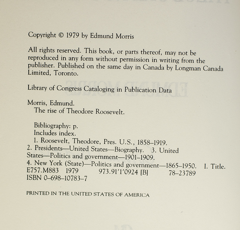 Later printing of the first book in the author's acclaimed Theodore Roosevelt Trilogy. Octavo, original cloth, illustrated with photographs. Signed by Edmund Morris on the title page. Very good in a very good dust jacket. Jacket design by Regine de Toledo. Author photograph by Ian Keown.