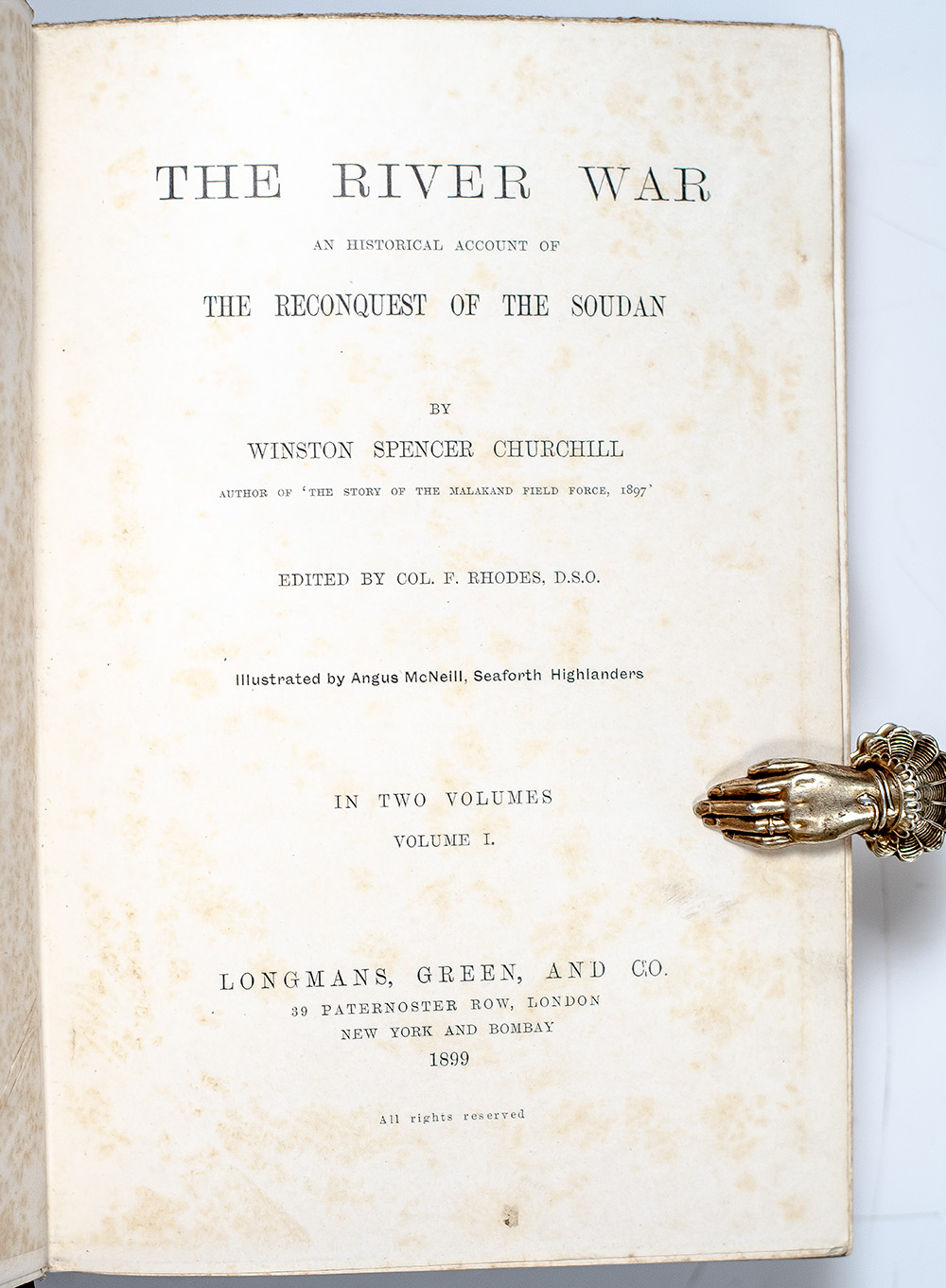 First editions of Churchill's history of the conquest of the Sudan. Octavo, 2 volumes, original cloth, illustrated with 22 maps and plans, several folding. Association copy, with signatures and annotations by E.B. Lack, who helped to supply gunboats to the Admiralty during the campaign. Woods A2(a). In near fine condition. Housed in a custom half morocco clamshell slipcase.