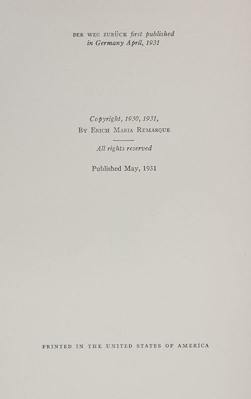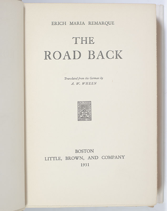 First American edition of the sequel to Remarque's masterpiece All Quiet on the Western Front. Octavo, original cloth. Presentation copy, inscribed by the author on the front free endpaper. Near fine in a near fine dust jacket. Jacket design by Paul Wenck. We have never seen another signed example of this title.