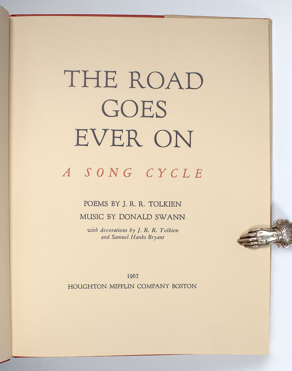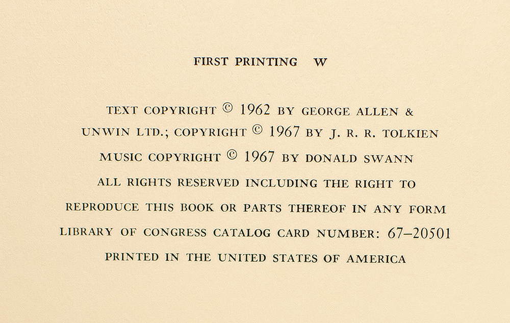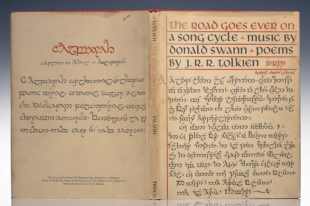 First edition of the first appearance in sheet music form of the classic song cycles that appeared throughout The Hobbit and Lord of the Rings Trilogy. Quarto, original boards with gilt titles and gilt tooling to the spine and front panel. Poems by J.R.R. Tolkien. Music by Donald Swann. With decorations by J.R.R. Tolkien and Samuel Hanks Bryant. The songs from the book were sold simultaneously in a record album entitled Poems of the Middle Earth with verse performed by Tolkien and piano accompaniment performed by William Elvin. Near fine in a near fine price-clipped dust jacket. Jacket photographs by Roger Hill and Brian Shuel. An exceptional example.