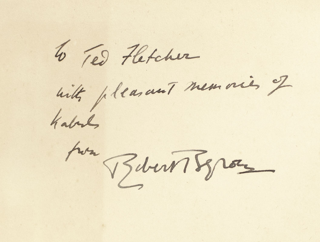First edition of the author's masterpiece. Octavo, original cloth, frontispiece, 15 plates and a map. Association copy, inscribed by the author on the front free endpaper, "To Ted Fletcher with pleasant memories of Kabul from Robert Byron." The recipient, was Major Fletcher, a member of the British Legion in Kabul in the late 1930s and early 1940s, acting as a war military attache and intelligence officer. Fletcher is mentioned in this volume by Byron that the Major had driven him out to see Dar-al-Aman and Paghman on an excursion from Kabul. Near fine in a very good dust jacket with some rubbing and wear to the extremities. Rare in the original dust jacket and with such an association.