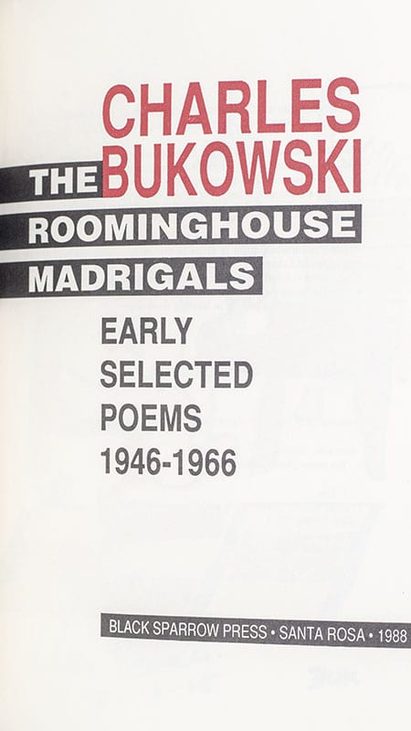 "Night has come like something crawling up the bannister, sticking out its tongue of fire": First Edition of Charles Bukowski's The Roominghouse Madrigals; one of 150 copies hand-bound by Earle Gray with an original color screen print signed by Bukowski