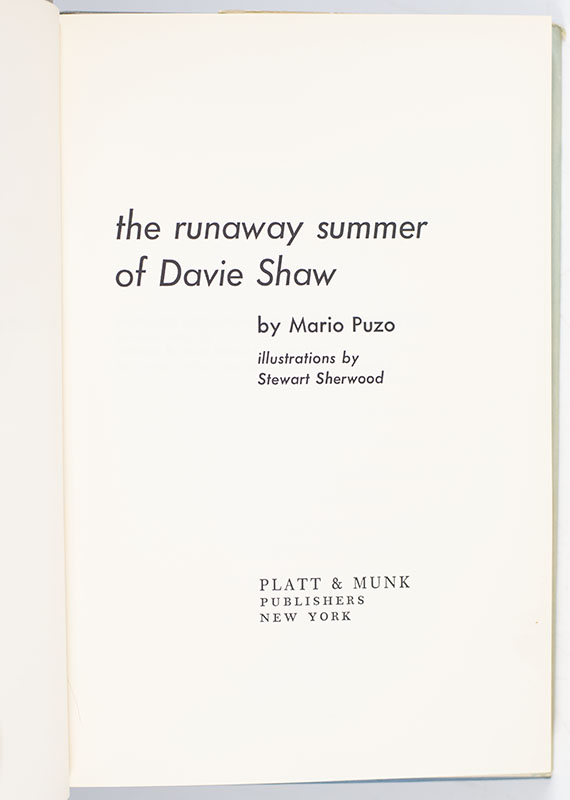 "When you read this book eight years from now, I hope you will not": First Edition of Mario Puzo's The Runaway Summer of Davie Shaw; Lengthily Inscribed by Him