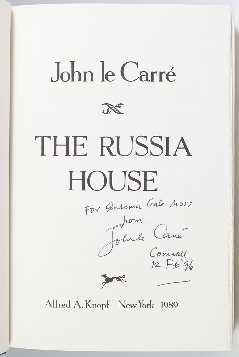 First Edition of The Russia House; Warmly inscribed by John Le Carre and signed again on the dust jacket