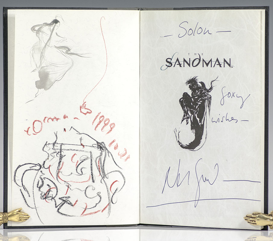 First edition of Gaiman's award-winning graphic novel. Tall octavo, original half cloth with gilt titles to the spine and font panel, glossy illustration affixed to the front panel. Illustrated by Yoshitaka Amano. Presentation copy, inscribed by the author on the half-title page, "Solon - foxy wishes - Neil Gaiman" and with an original drawing by the illustrator opposite the half-title page. In fine condition. Rare and desirable signed by both the author and illustrator.