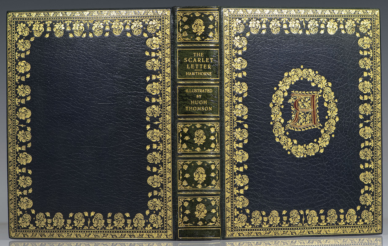 First illustrated edition by Hugh Thomson of Hawthorne's masterwork. Quarto, bound in full morocco by Bayntun-Riviere with morocco spine labels lettered in gilt, elaborate gilt tooling to the spine, front and rear panels, raised gilt bands, double gilt ruling to the panels with gilt turn-ins and inner dentelles, marbled endpapers, all edges gilt, tipped-in frontispiece with captioned tissue guard, title vignette, 30 tipped-in color plates with captioned tissue guards, all by Thomson. In fine condition. An exceptional example.