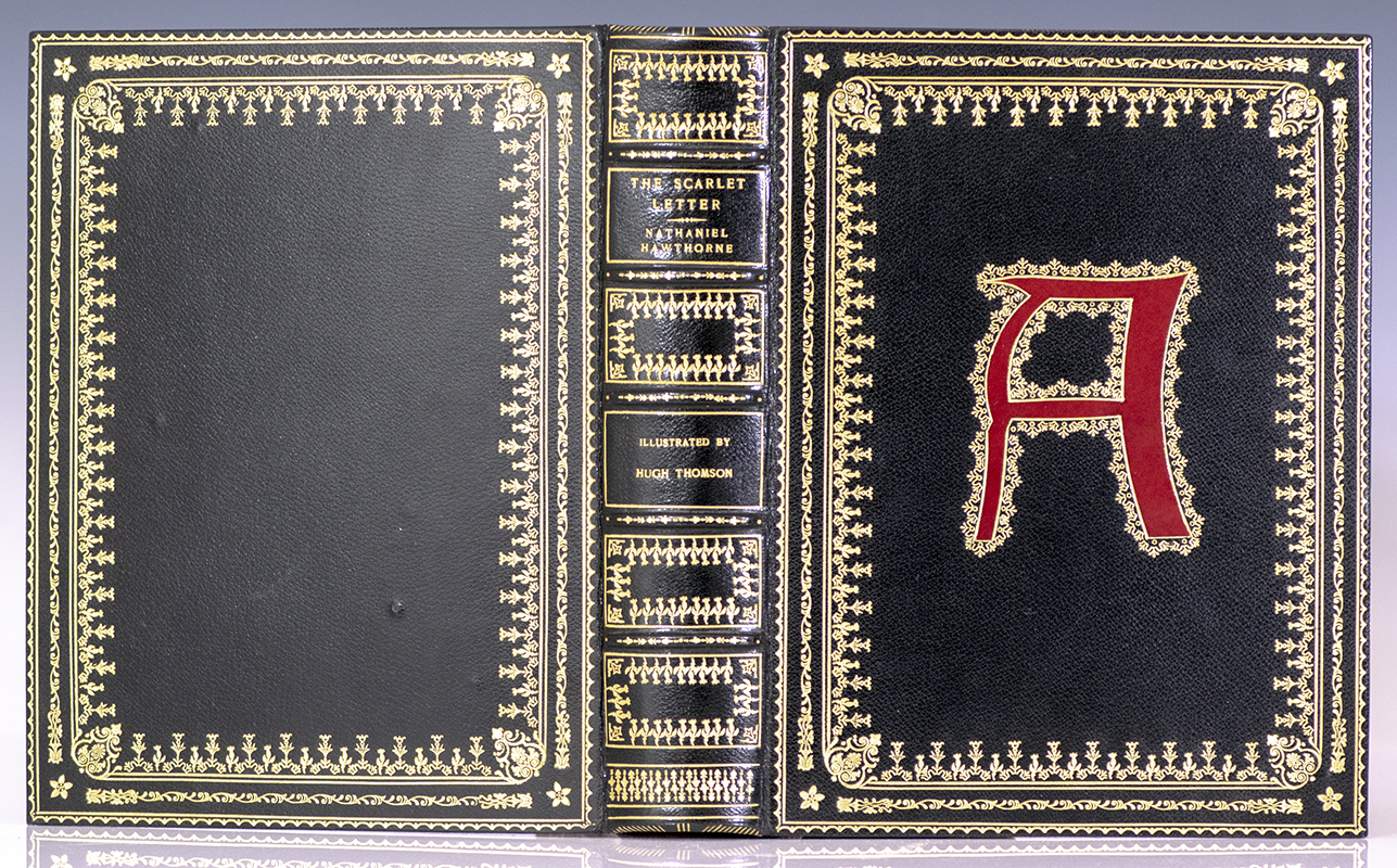 First edition thus of Hawthorne’s masterpiece. Quarto, bound in full morocco by Bennett, elaborate gilt tooling to the spine, with scarlet leather onlay of the letter A on the front panel, gilt turn-ins and inner dentelles, marbled endpapers, all edges gilt, illustrated with 31 mounted color plates by Hugh Thomson. In fine condition. Housed in a linen slip case and chemise box. An exceptional example from The Bennett Book Studios, a fine book bindery in New York City established in the late 1920s by bookman and binder Whitman Bennett. From the library of bibliophile and Grolier Club member David Allen Fraser.