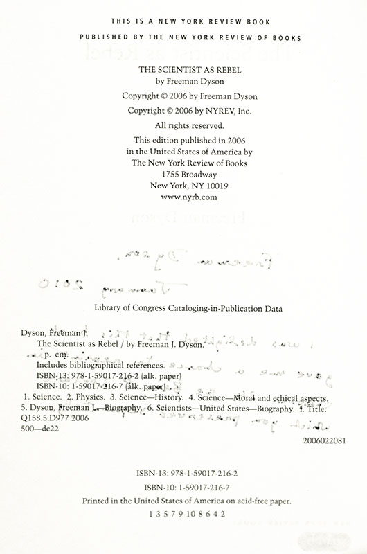 "From Galileo to today's amateur astronomers, scientists have always been rebels": First Edition of Freeman Dyson's The Scientist As Rebel; inscribed by Freeman Dyson