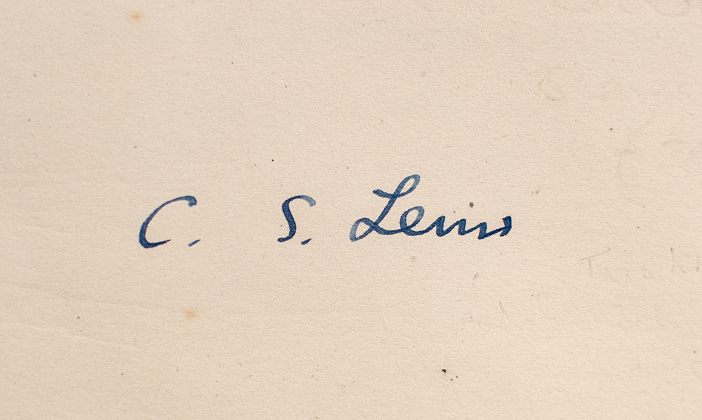 First edition of Lewis' classic work. Octavo, original cloth. Boldly signed by C.S. Lewis on the front free endpaper. Near fine in a near fine dust jacket. Housed in a custom half morocco chemise and clamshell box. Exceptionally rare signed.