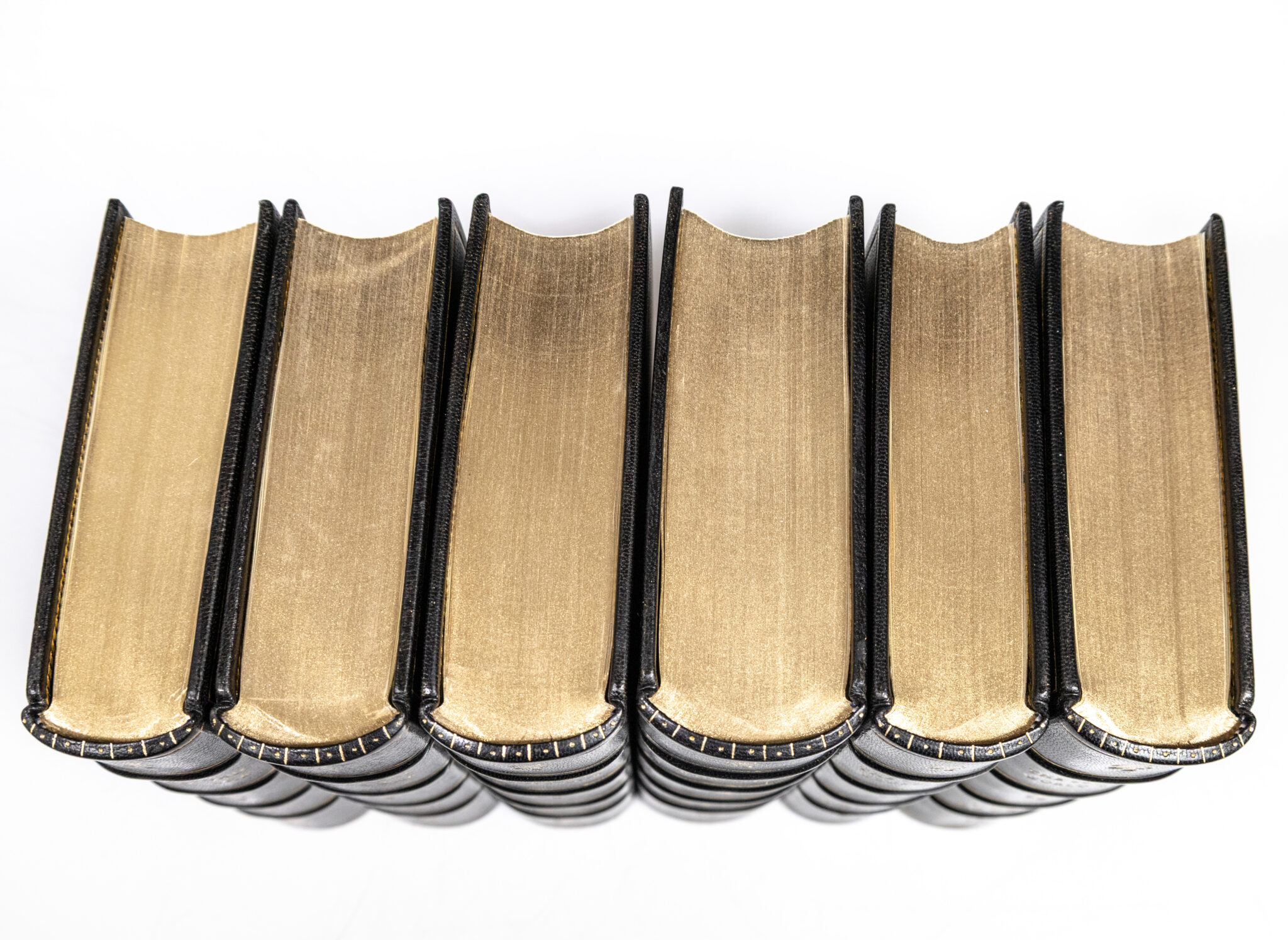 First editions of each volume in Winston Churchill's masterpiece. Octavo, six volumes, bound in full morocco by the Harcourt Bindery with gilt titles and tooling to the spine in six compartments within raised gilt bands, gilt ruling to the front and rear panels, gilt, facsimile Winston Churchill signature to the front panel of each volume, gilt inner dentelles stamp-signed by the Harcourt Bindery, marbled endpapers, all edges gilt in 22 karat gold. Founded over a century ago in 1900, the Harcourt Bindery is the oldest and largest traditional bindery in America exclusively devoted to fine traditional leather bookbinding by hand. In fine condition. An exceptional presentation.