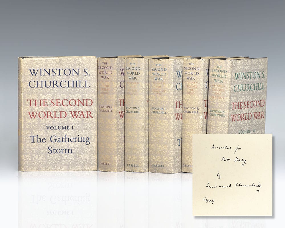 First editions of Churchill’s World War II masterpiece. Octavo, six volumes, original black cloth, patterned endpapers. Presentation copy, inscribed and dated by the author on the half-title page of volume one, "Inscribed for Mrs. Daly by Winston S. Churchill 1949." Volumes II-VI are first editions, volume I is a first revised edition. Each are near fine in near fine dust jackets. A very sharp set.