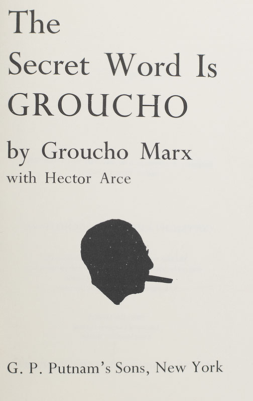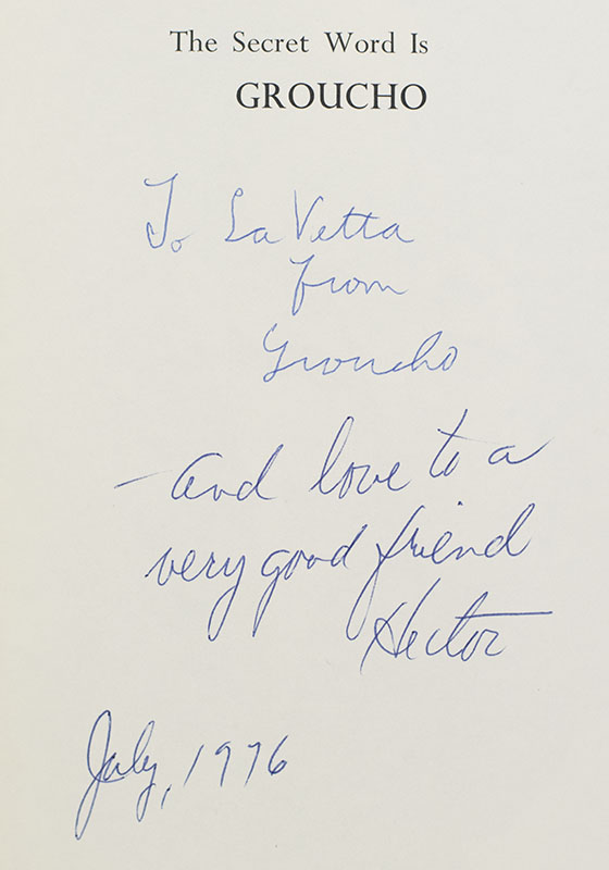 "I intend to live forever, or die trying": First Edition of The Secret Word Is Groucho; Inscribed by Legendary Comedian Groucho Marx and Hector Arce to Fashion Designer LaVetta Forbes