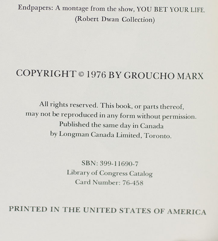 First edition of this work which contains the best humor of Groucho Marx. Octavo, original cloth, illustrated endpapers, frontispiece, illustrated. Association copy, inscribed by both authors on the half-title page, "To LaVetta from Groucho - and love to a very good friend Hector July 1976." The recipient, LaVetta Forbes was a well-known fashion designer in Beverly Hills, where Marx lived for the last twenty years of his life. Near fine in a near fine dust jacket. Jacket drawing by Al Hirschfeld. Jacket design by Cheryl Asherman. Uncommon signed and inscribed as Marx was in ill health when this title was published and passed away a year later August 1977.