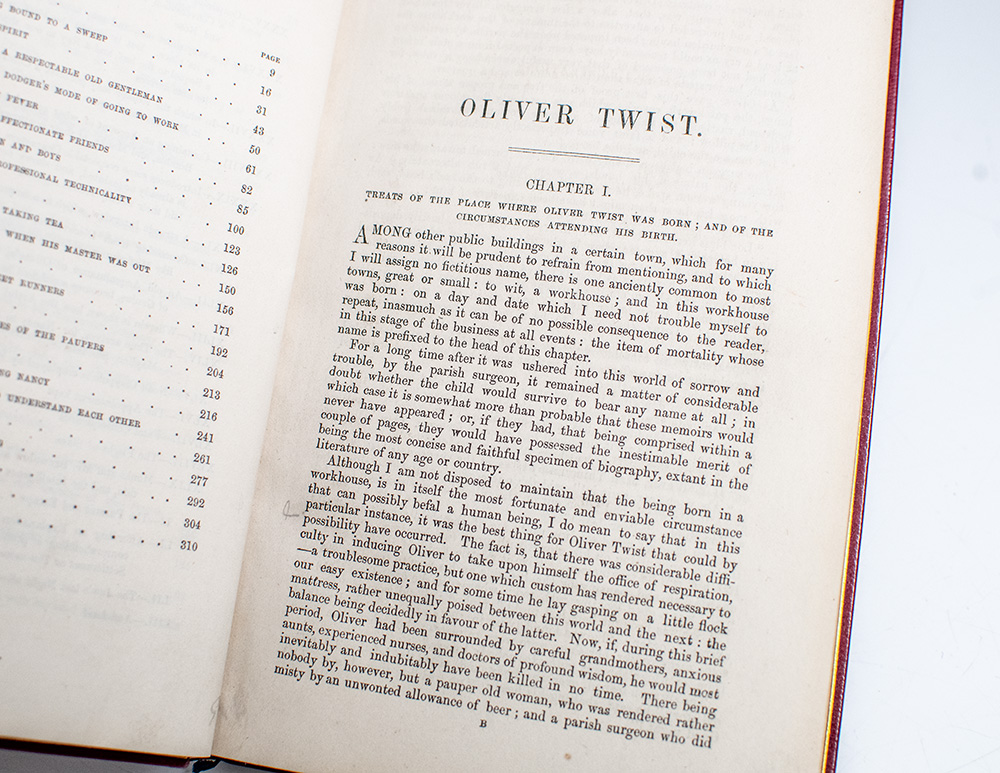 The Selected Works of Charles Dickens: Sketches by Boz Illustrative of Every-Day Life and Every-Day People, The Posthumous Papers of the Pickwick Club, The Life and Adventures of Nicholas Nickleby, Master Humphrey’s Clock, The Life and Adventures of Martin Chuzzlewit, Dombey and Son, The Personal History of David Copperfield, Bleak House, Hard Times. For These Times, Little Dorrit, A Tale of Two Cities, The Uncommercial Traveller, The Adventures of Oliver Twist, Our Mutual Friend, The Mystery of Edwin Drood.