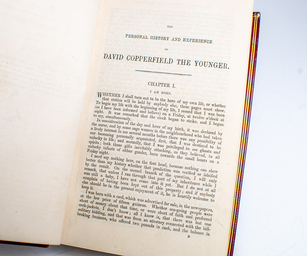 Finley bound collection of the selected works of Charles Dickens. Octavo, 15 volumes finely bound in full straight grain morocco by Carss & Co. with gilt titles and tooling to the spine in six compartments within raised gilt bands, triple gilt ruling to the front and rear panels, gilt turn-ins and double gilt-ruled inner dentelles, marbled endpapers, all edges gilt, ribbons bound in. The collection includes: The Posthumous Papers of the Pickwick Club. London: Chapman and Hall, 1838. Later issue. Illustrated with etched plates by Robert Seymour and Hablot Knight Browne ("Phiz"); Sketches by Boz Illustrative of Every-Day Life and Every-Day People. London: Chapman and Hall, 1839. New edition, Complete; The Life and Adventures of Nicholas Nickleby. London: Chapman and Hall, 1839. First edition in book form. Illustrated with 39 etched plates by Hablot Knight Browne ("Phiz"); Master Humphrey's Clock. London: Chapman and Hall, 1840. Three volumes bound in one. First edition in book form; The Life and Adventures of Martin Chuzzlewit. London: Chapman and Hall, 1844. First edition in book form, first issue (with "100PS" on engraved title). Illustrated with 40 etched plates by Hablot Knight Browne ("Phiz"); Dombey and Son. London: Bradbury and Evans, 1848. First edition in book form. Lacking half title; errata mounted following p. xvi. Illustrated with 40 etched plates by Hablot Knight Browne ("Phiz"); The Personal History of David Copperfield. London: Bradbury & Evans, 1850. First edition in book form. Illustrated with 40 etched plates by Hablot Knight Browne ("Phiz"); Bleak House. London: London: Bradbury and Evans, 1853. First edition in book form. Lacking half-title. Illustrated with 40 etched plates by Hablot Knight Browne ("Phiz"); Hard Times. For These Times. London: Bradbury & Evans, 1854. First edition; Little Dorrit. London: Bradbury and Evans, 1857. First edition in book form. Illustrated with 40 etched plates by Hablot Knight Browne ("Phiz"); A Tale of Two Cities. London: Chapman and Hall, 1859. First edition in book form, mixed issue (with p. 213 correctly paginated, but p. 134, line 12 with "affectionately" misspelled, and no signature "B" to list of plates leaf. Without 32-pp. ads at rear found in some copies. Illustrated with an etched frontispiece, etched vignette title page, and 14 etched plates by Hablot Knight Browne ("Phiz"); The Uncommercial Traveller. London: Chapman and Hall, 1861. Third edition; Our Mutual Friend. London: Chapman and Hall, 1865. Two volumes bound as one. First edition in book form. Lacking half-titles and ads. Illustrated with 40 etched plates by Marcus Stone; The Mystery of Edwin Drood. London: Chapman and Hall, 1870. First edition in book form. Illustrated with engraved portrait by Baker, and 12 etched plates and vignette title-page by S.L. Fildes. In near fine condition with scattered foxing throughout the volumes. A stunning set.