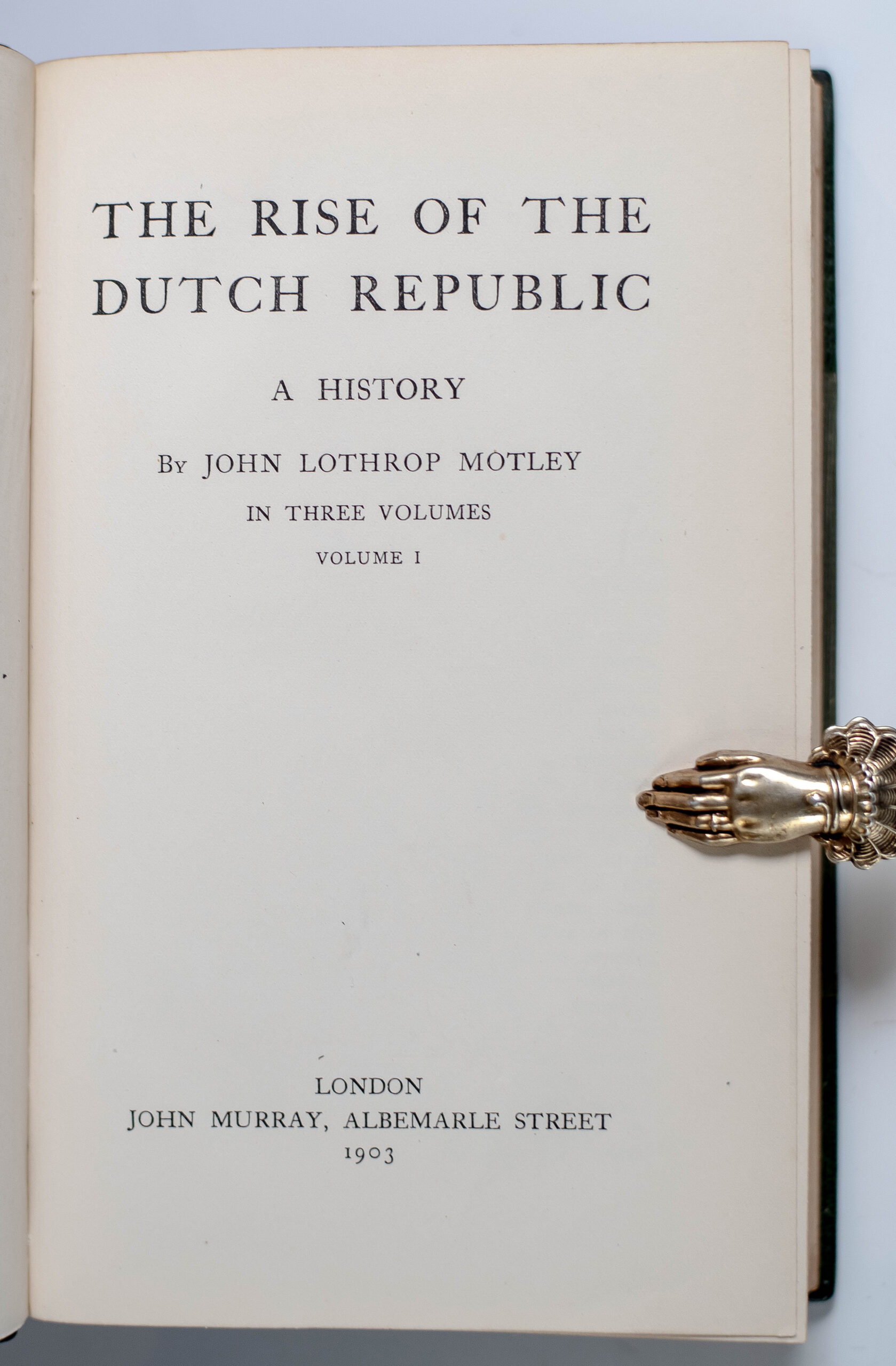 Finely bound set of the selected works of John Lothrop Motley. Octavo, 9 volumes bound in three quarters morocco with gilt titles and ruling to the spine in six compartments within raised bands, top edge gilt, tissue-guarded frontispece to each volume. In near fine condition.