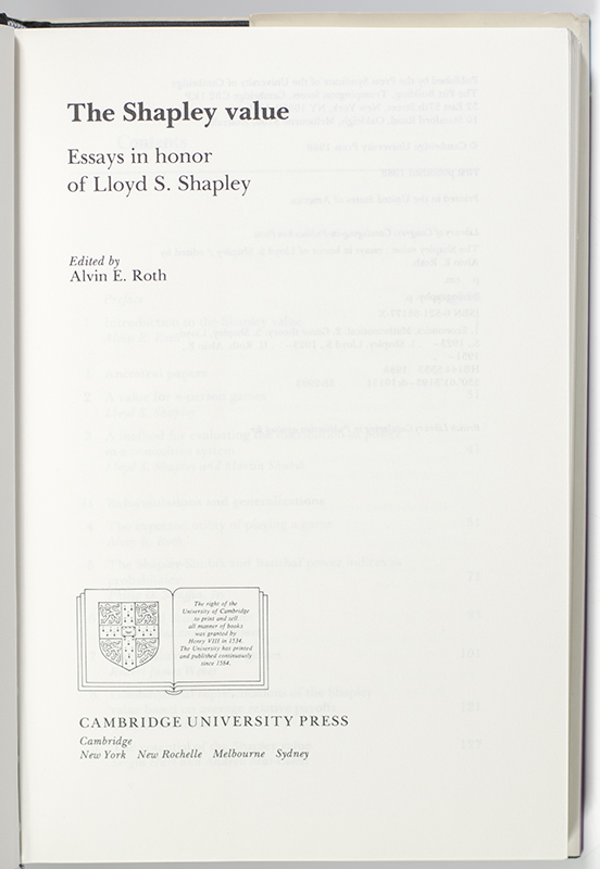 First Edition of The Shapley Value; Inscribed by Nobel Prize-winning economists Alvin Roth and Robert Aumann