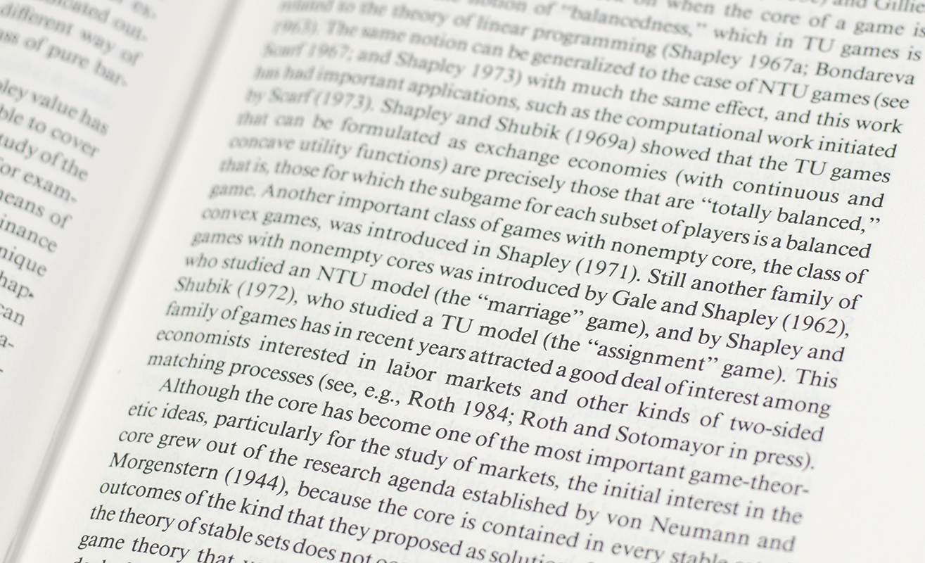 First edition of this work regarding the papers of Nobel Prize winner Lloyd Shapley. Octavo, original cloth. Presentation copy, inscribed by Nobel Prize-winning economists on the front free endpaper, "Best wishes to John Rogers, Alvin E. Roth Stanford, 4 Nov '13"  and "For John Bob Aumann." Near fine in a very good dust jacket. Jacket design by Ken Vail.