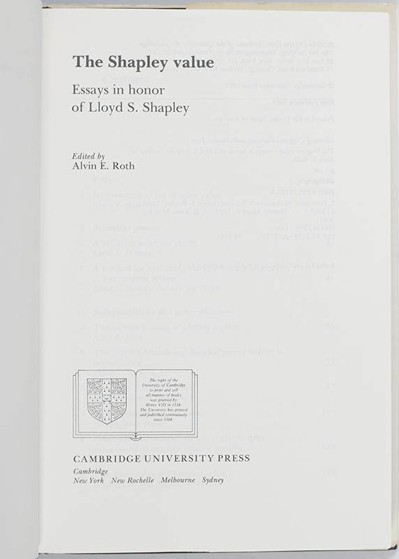 First Edition of The Shapley Value; Inscribed by Nobel Prize-winning economist Alvin Roth
