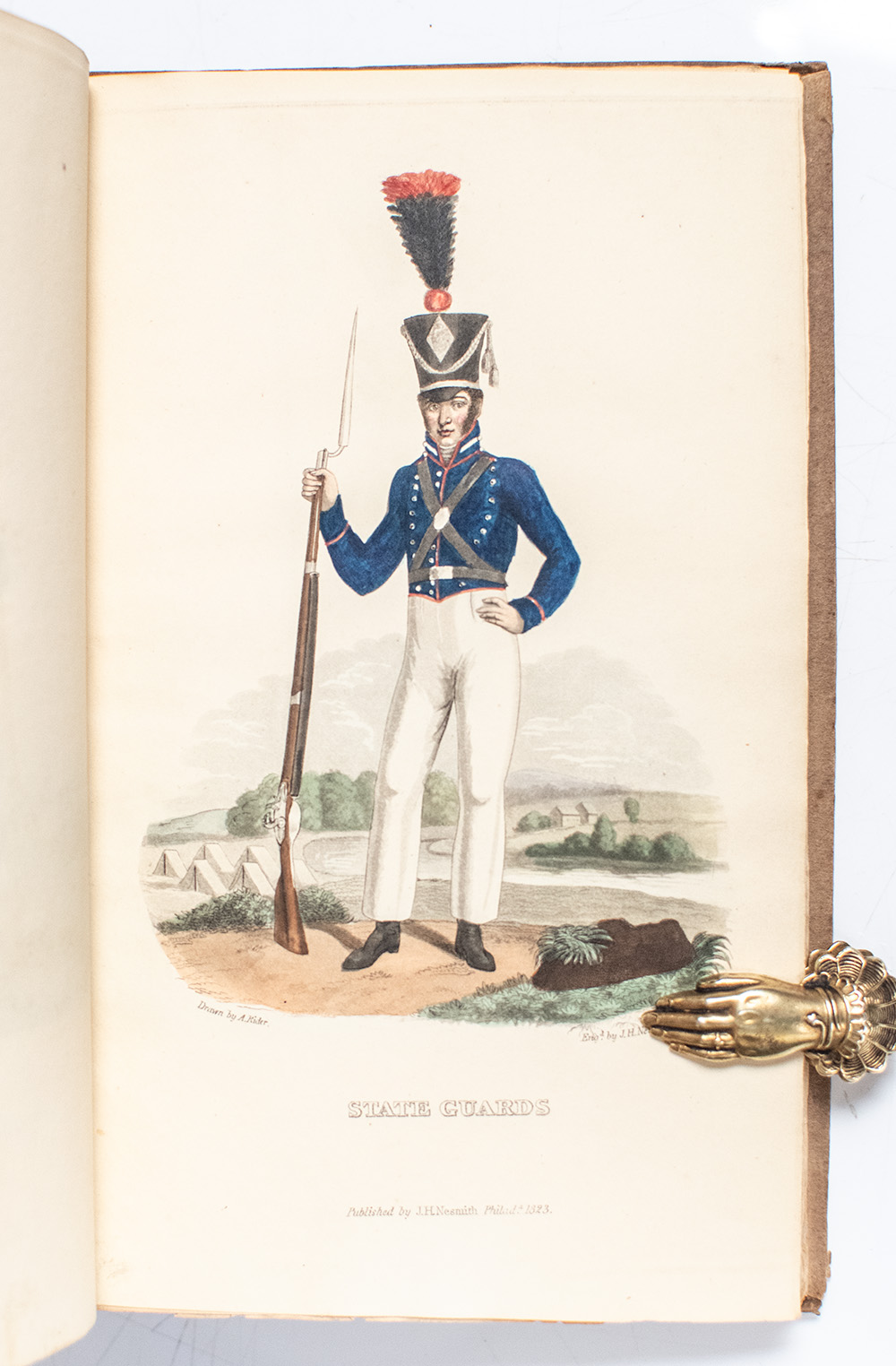 First edition of the first American military color plate book. Quarto, original publisher's boards, illustrated with twelve plates representing volunteer corps in the first division Pennsylvania militia. In very good condition with the plates exceptionally bright. Housed in a custom half morocco clamshell box. Rare, one of only three known complete copies. This example was held in a private collection for forty-five years and was last seen at auction in 1980.