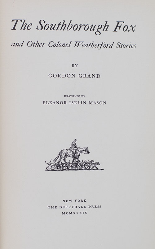 First edition of the author's collection of fox-hunting stories featuring the fictional Colonel Weatherford. Octavo, original cloth. Illustrated with drawings by Eleanor Iselin Mason. Signed by the author on the half-title page. One of 1450 copies printed for Eugene V. Connett at the Derrydale Press. Bookplate. In near fine condition.