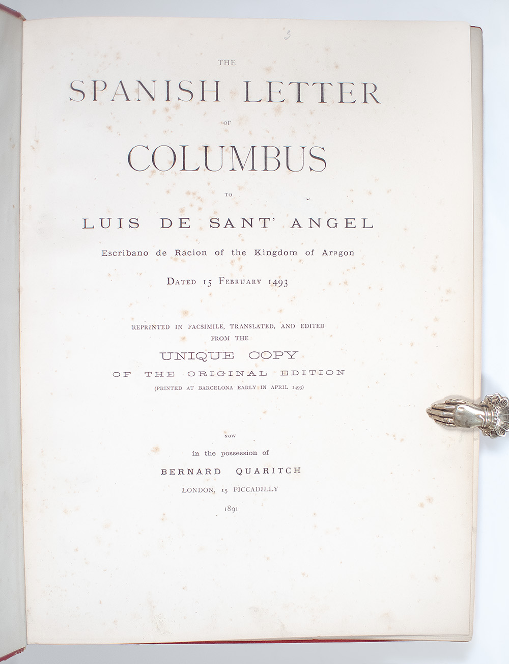 First edition of the facsimile edition of Christopher Columbus' letter to Luis de Santángel about his initial voyage to the Americas. Folio, half morocco with gilt titles and tooling to the spine, folding facsimile of letters at center. In very good condition, rebacked. An exceptional example, rare in this condition.