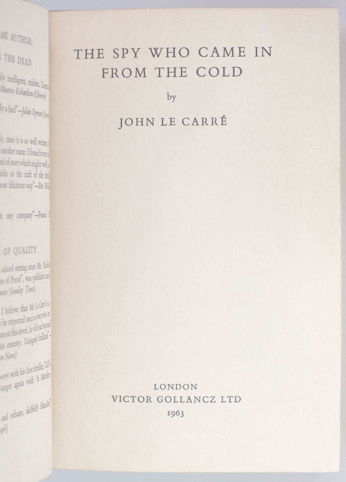 First edition of le Carre's classic work, which went on to reinvigorate the spy genre. Octavo, original cloth. Signed by the author on a tipped-in page, "John le Carre with best wishes 16 ix 64." Near fine in a near fine dust jacket.