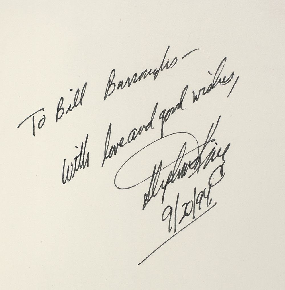 First edition of the author's classic fourth novel. Thick octavo, original half cloth. Association copy, inscribed by the author on the front free endpaper, "For Bill Burroughs- With love and good wishes Stephen King 9/20/94." The recipient, William Burroughs is credited as a primary figure of the Beat Generation and a major postmodern author who influenced popular culture and literature. His writings had a strong influence on King as an adolescent and young man. As a English major at the University of Maine, King was taught by instructors who consciously identified with the beat movement. Burroughs was also impressed by the writings of King and in the summer of 1979 discussed King's The Shining as part of the NAROPA lectures on “Creative Reading." Fine in a near fine dust jacket. Jacket illustration by John Cayea. From the library of William Burroughs. Housed in a custom half morocco clamshell box by the Harcourt Bindery. An exceptional association linking two great writers of the last half of the twentieth century.