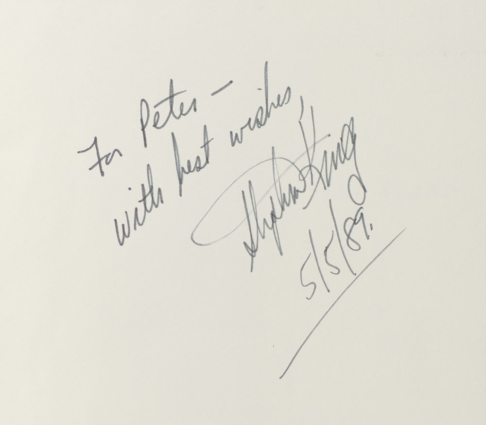 First edition of the author's classic fourth novel. Thick octavo, original half cloth. Association copy, inscribed by the author on the front free endpaper, "For Peter- With good wishes Stephen King 9/20/94." Fine (without the usual sag associated with this bulky volume) in a fine dust jacket. Jacket illustration by John Cayea. An exceptional example.