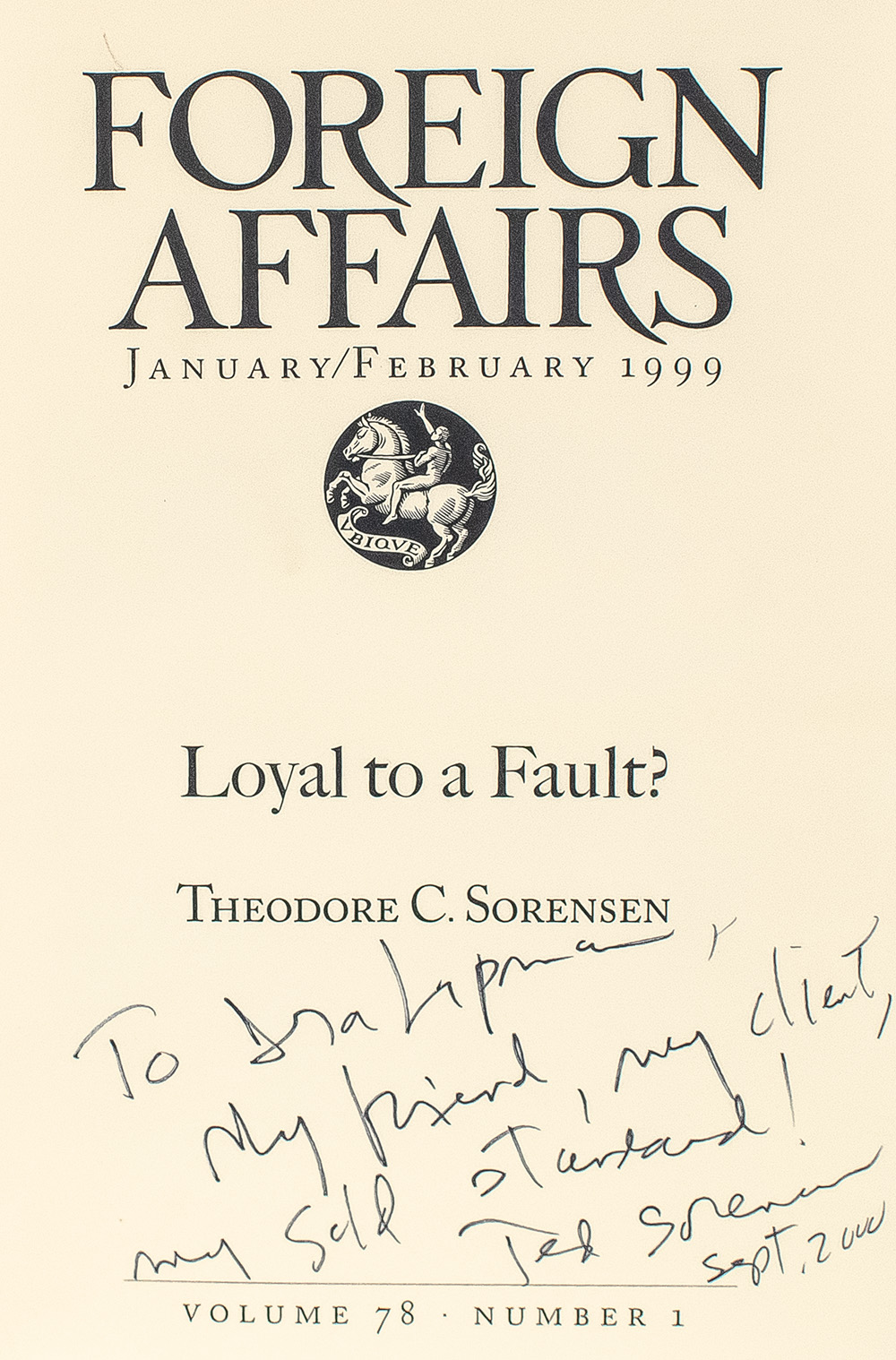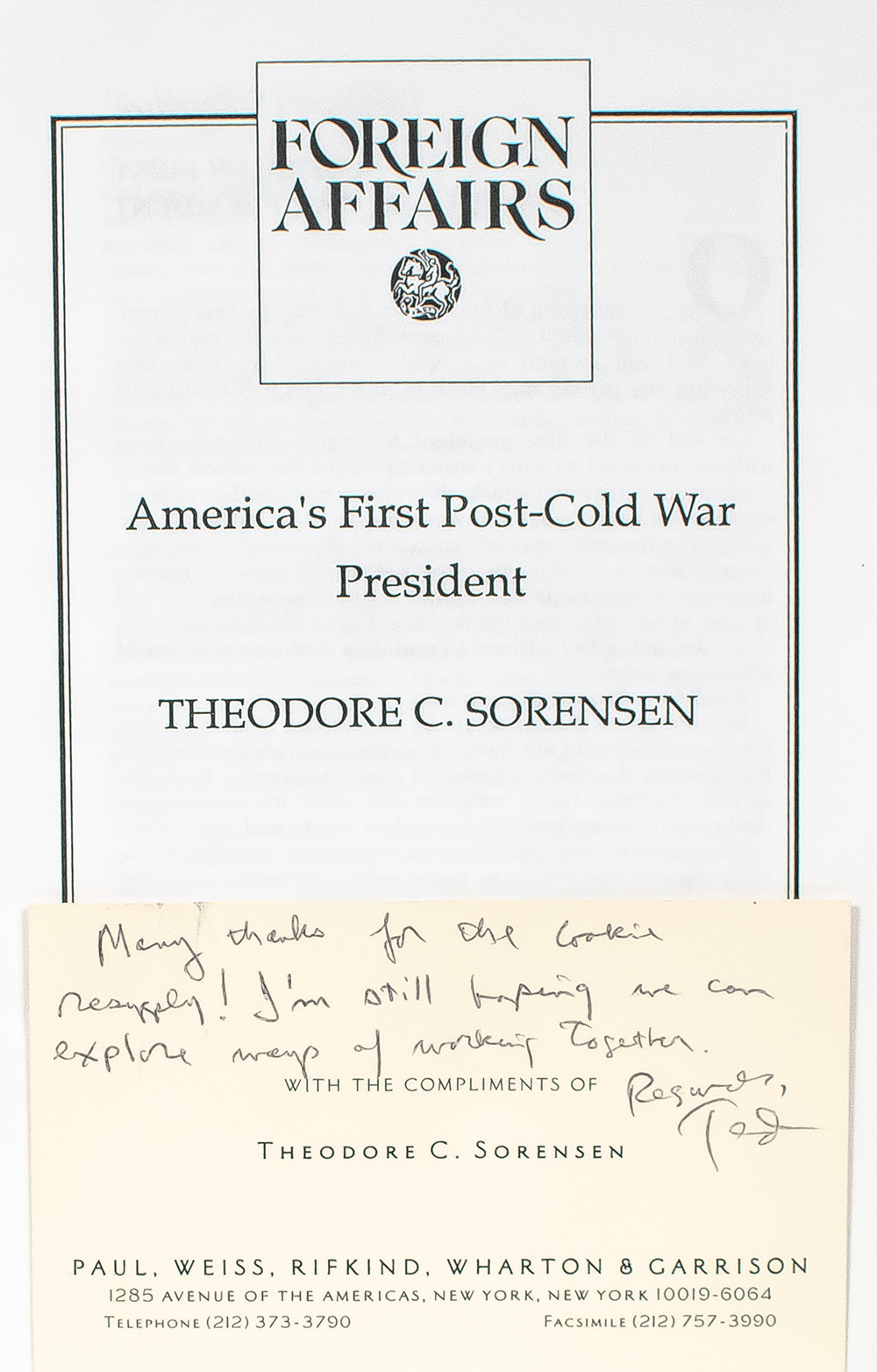 The Stark Reality of Responsibility. [WITH] Two Issues of Foreign Affairs: Loyal to a Fault? and America's First Post-Cold War President. [AND] Theodore Sorensen Autograph Note Signed.