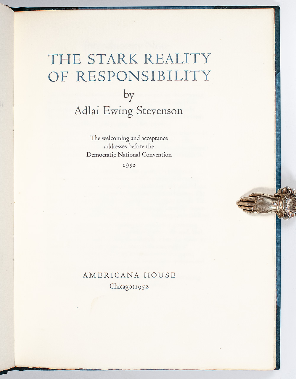 Limited first edition of Adlai Ewing Stevenson's welcoming and acceptance addresses before the Democratic National Convention. Quarto, original publisher's three quarter blue morocco over cloth with gilt titles to the spine, front panel stamped in gilt. One of one hundred copies printed on Maidstone hand-made paper and signed by the author on the half-title page. In near fine condition. Accompanied by two Foreign Affairs pamphlets by Theodore C. Sorensen: 'America's First Post-Cold War President' (Vol. 71 No. 4, Fall 1992, autograph note signed by Sorensen on Paul, Weiss, Rifkind, Wharton & Garrison 'Compliments' stationary secured with a paperclip, the note reads in full, "Many thanks for the cookie resupply! I'm still hoping we can explore ways of working together. Regards, Ted") and 'Loyal to a Fault?' (Vol. 78 No. 1, January/February 1999, association copy, inscribed by Sorensen, "To Ira Lipman, my friend, my client, my gold standard! Ted Sorensen Sept, 2000"). "A pioneer in the private security guard business," Ira Lipman's work has been cited cited by the United States Department of Justice's Law Enforcement Assistance Administration and the United States House Judiciary Subcommittee on Crime, Terrorism, Homeland Security and Investigations. In fine condition.