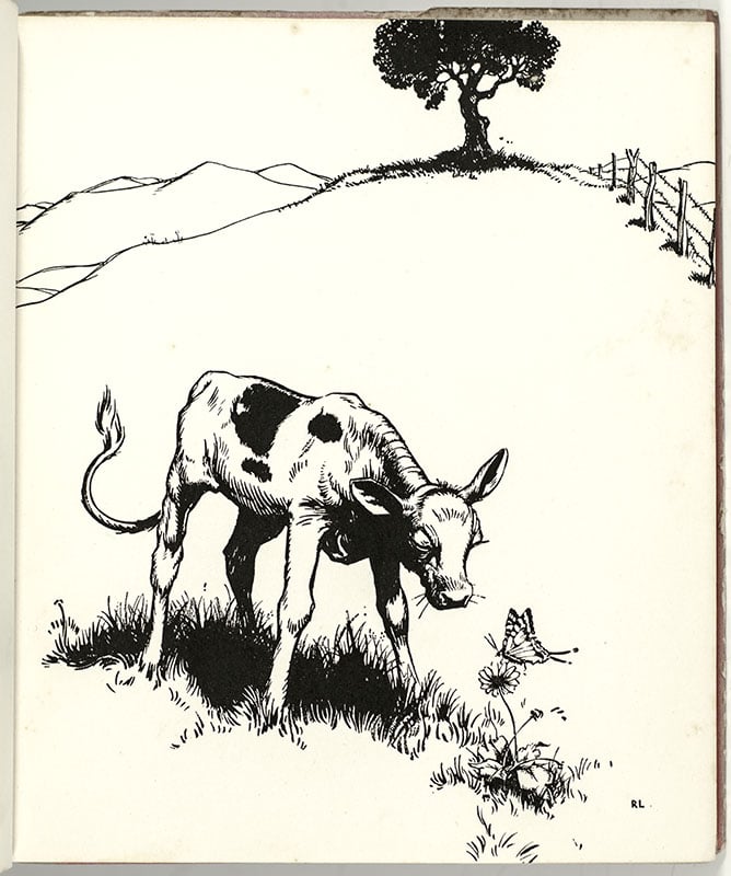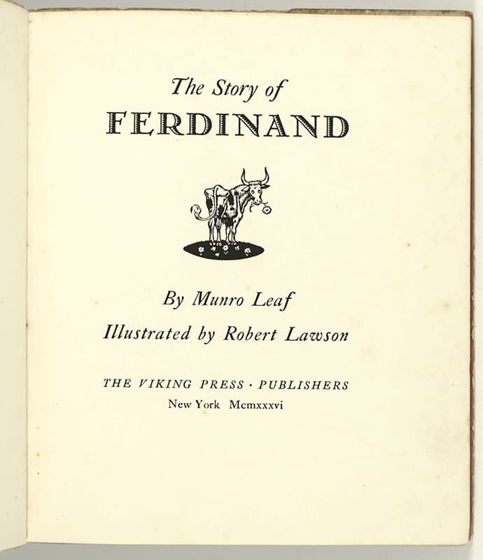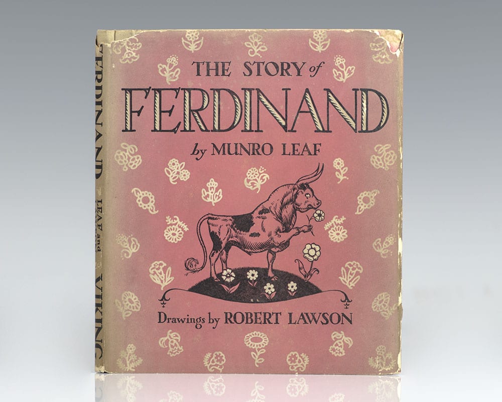 "This is perhaps one of the finest 20th-century examples of the inspired wedding of a text and illustrations to make a children’s book that as a whole is even greater than the sum of its parts-which are in themselves very fine indeed. The simple, delightful Leaf story about a Spanish bull who prefers the fragrance of flowers to the roar of the bull-ring is lovingly illustrated by Robert Lawson. The overworked word ‘classic’ is well deserved here. Children have adored The Story of Ferdinand ever since the book was published" (Early Children’s Books and Their Illustrations). Translated into over 60 languages, Munro Leaf's classic became a number one bestseller in 1938 and has never gone out of print since. Despite its beloved place in children's literature, the book was banned in many countries including Spain and Nazi Germany who denounced it as a pacifist work and 'democratic propaganda.' Following the 1945 defeat of Germany during the Second World War, 30,000 copies were published to be given to the children of Germany in an effort to encourage peace. The book was adapted by Walt Disney into the classic short animated film Ferdinand the Bull in 1938, and more recently into the feature-length computer animated film, Ferdinand, produced by 20th Century Fox Animation.