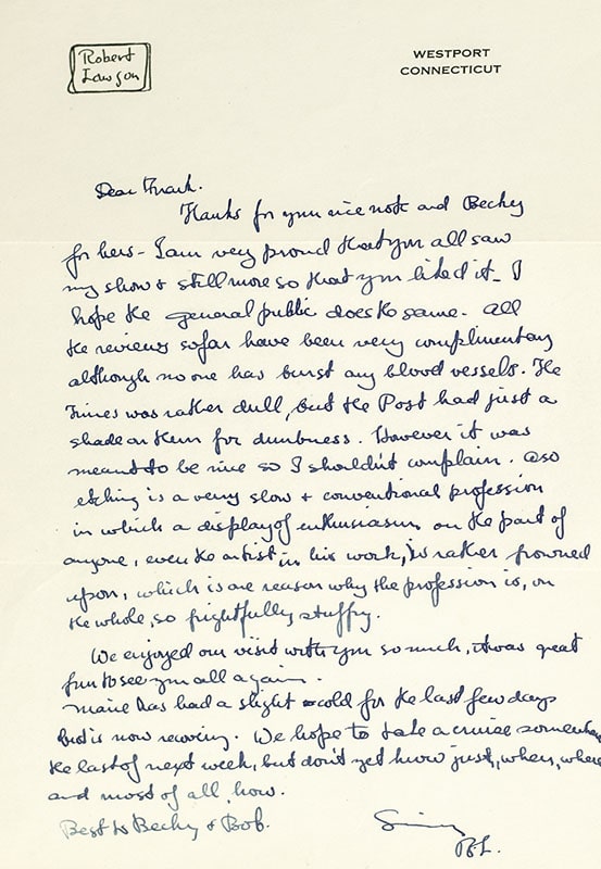 First edition of Munro Leaf's beloved children's classic. Octavo, original half tan cloth over illustrated boards, pictorial endpapers. Illustrated by Robert Lawson. Presentation copy, inscribed by both the author and illustrator opposite the title page in the year of publication, "To Beck and I hope she'll like it Robert Lawson Aug. 29. 1936" and "'Me too' Munro Leaf." Laid in is the original transmittal autograph letter signed and entirely in the hand of Robert Lawson on his personal letterhead which reads in full, "Dear Frank thanks for your nice note and Becky for hers - I am very proud that you all saw my show & still more so that you liked it. I hope the general public does the same. All the reviews so far have been very complimentary although no one has burst any blood vessels. The Times was taken dull, but the Post had just a shade on them for dumbness. However it was meant to be nice so I shouldn't complain. Also etching is a very slow & conventional profession in which a display of enthusiasm on the part of anyone, even to artist in his work, is often frowned upon, which is one reason why the profession is, on the whole, so frightfully stuffy. We enjoyed our visit with you so much, it was great fun to see you all again. Marie has had a slight cold for the last few days but is now recovering. We hope to take a cruise somewhere the last of next week, but don't know how just, when, where and most of all how. Best to Becky & Bob. Sincerely, R.L." In the early 1930s before he began to focus exclusively on children's books, Lawson became interested in etching and proved skilled enough to receive the John Taylor Arms Prize from the Society of American Etchers in 1931. Housed in a custom half morocco clamshell box. Very good in a very good price-clipped dust jacket with the $1 present on the rear flap. One of the most sought after children's books of the twentieth century, particularly scarce and desirable signed by Leaf and Lawson.